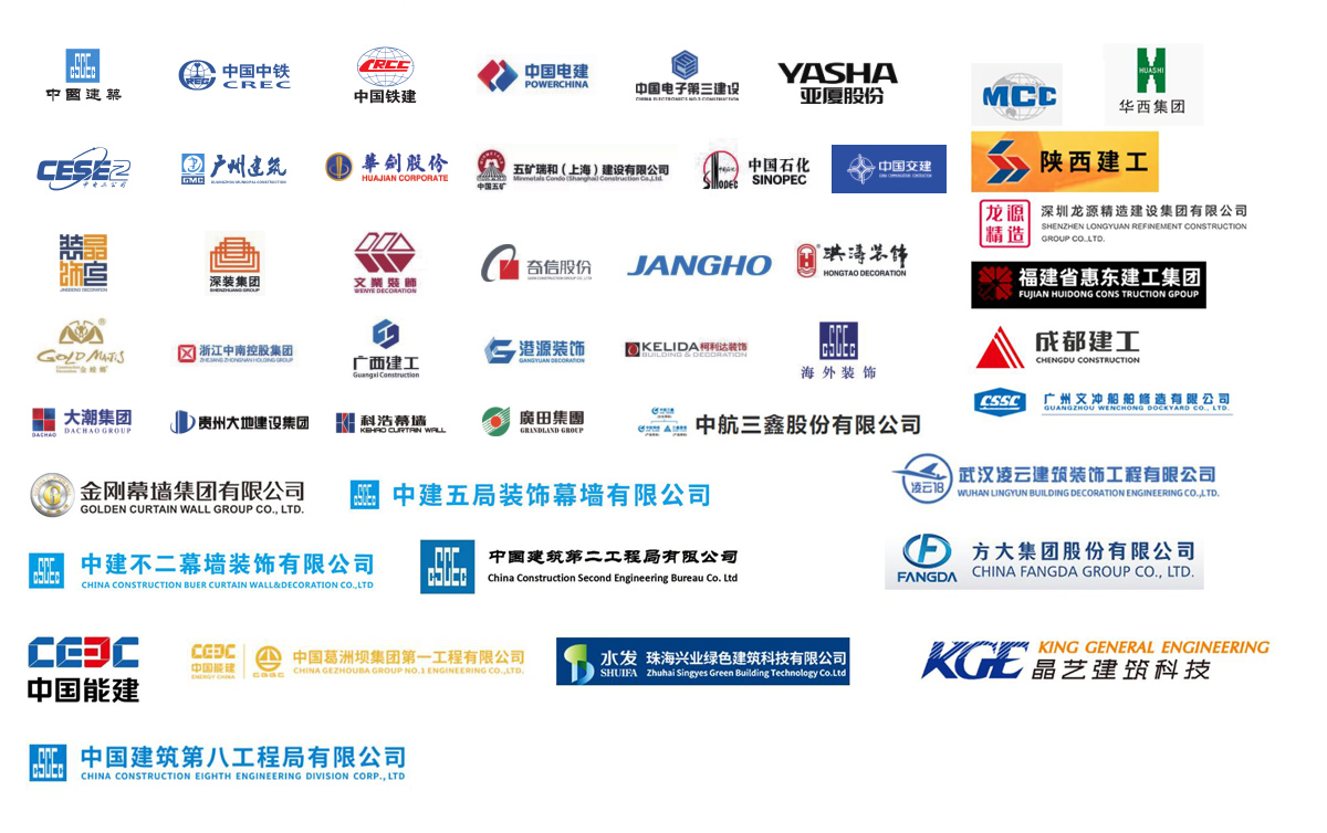 公司參建了諸多大型項目工程,如港珠澳大橋、珠海國際航展、深圳國際會展中心、廣州白云機(jī)場、西安全運(yùn)會場館、成都東安湖大運(yùn)會場館、樂山奧體中心、洛陽奧體中心、增城富士康廠房、惠州中海油、陽江核電站、珠三角各地鐵線、高鐵站、廣西桂林機(jī)場、廣西柳州文化廣場、四川成都天府機(jī)場、海南??诿捞m機(jī)場、西安絲路會展中心、惠州北站等等。與中國建筑、中國中鐵、中國鐵建、中國電建、中國交建、中國中冶、中國能建、廣東建筑、廣西建工、廣州建筑等大型國有企業(yè)下屬公司及江河幕墻、金螳螂裝飾等各大建筑裝飾、幕墻裝飾公司達(dá)成長期友好合作關(guān)系。